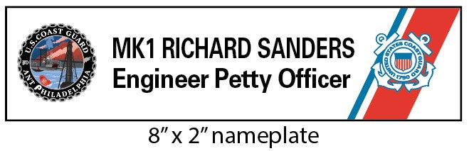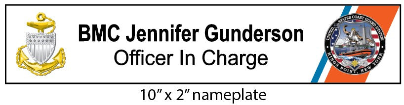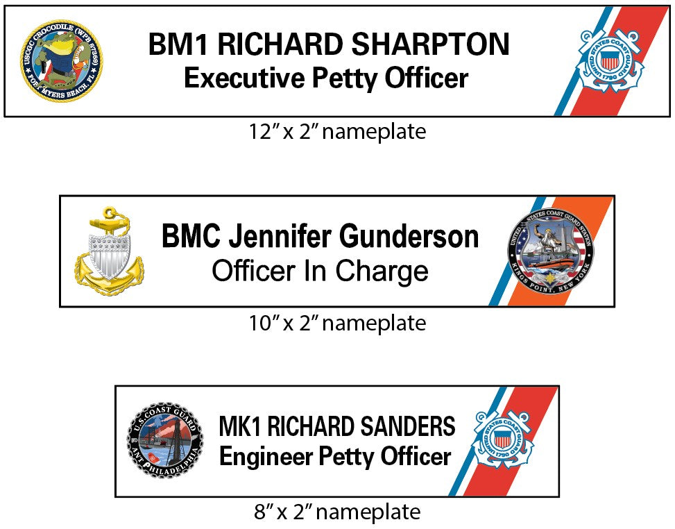 Nameplates are printed in full color with options for, crest, ranks, titles or whatever else you would like on your personalized nameplate. Standard size is 10" x 2", but we can make any size you wish - just contact us for a custom quote!